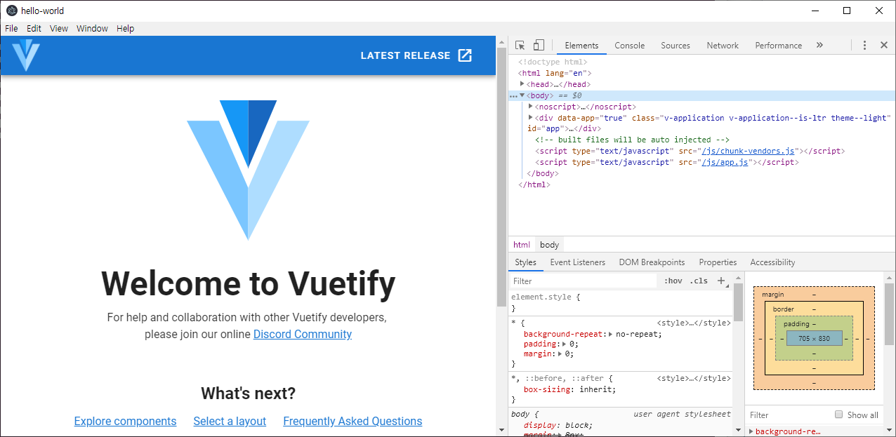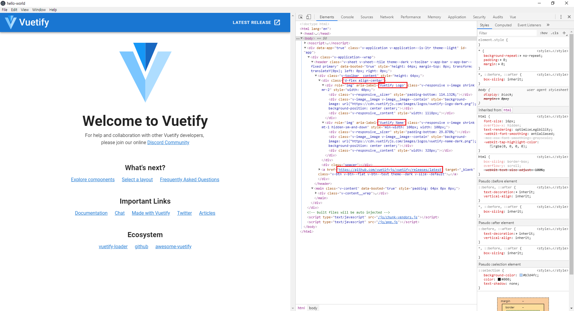 눈알에 힘주고 코드를 째려본다. 'Vuetify Logo', 'Vuetify Name', 'releases/latest' 뭐 이런 것들이 눈에 들어오긴 한다. 어? 이거 아까 실행된 앱에서 html을 막 훑어보다가 어서 본 것 같은데???
